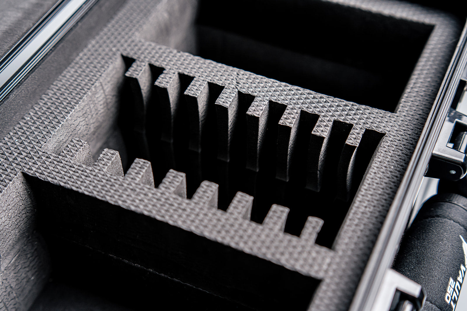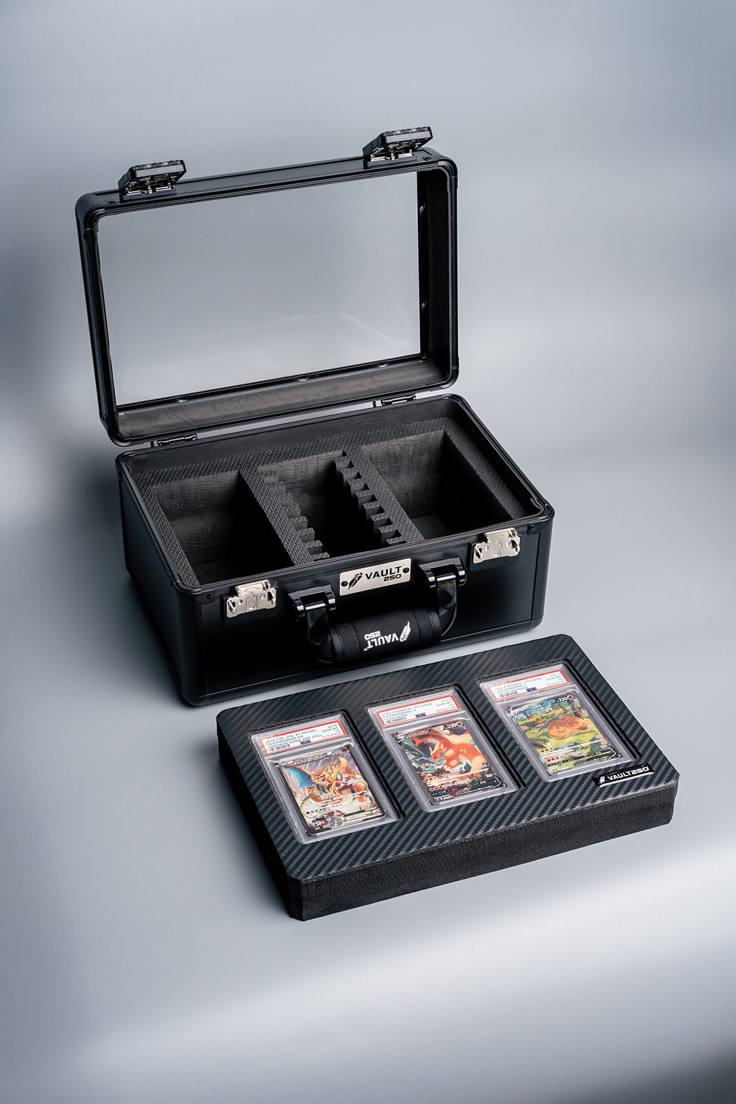 Charcoal high-density foam with molded slots (Base), Imitation carbon fiber on high density foam (Top). Place 3 PSA-graded collectibles or sports card slabs prominently at the front of the VAULT250™ Outlook storage case, adding an elegant display element to your collection.